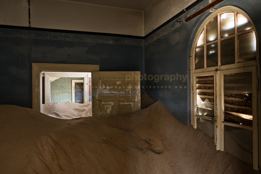SSP_NAB-SA2014-019 Description: Abandoned building interior at Kolmanskop German mining town: room with blue stencilled walls and broken shuttered window, windswept sand dunes,leading to other decorated rooms beyond, Kolmanskop, Namibia Keywords: Africa, African, Format, Kolmanskop, Luderitz, Namib, Namibia, Namibian, South West, abandoned, accommodation, architecture, building, buildings, close up, closeup, construction, country, desert, deserted, detail, dwelling, frame, habitation, home, horizontal, house, inside, interior, iron, jagged, landscape, landscape mode, living, mining town, residence, room, rusty, sand, sand dunes, shutters, structure, view, window frame Dimensions: 5040 x 3360 Camera: Canon EOS-1D X Exposure: 0,8 sec at f / 10 Focal Length: 24 mm ISO: ISO 100 Copyright: sarahsladephotography