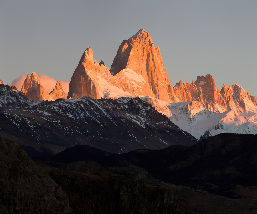 IMG_8965-Edit Description: Panorama view of sunrise over the snow covered Andes mountain range, El Chalten, Argentina, Patagonia, with clear blue sky, and mountains of Mount Fitzroy and Cerro Torre reflecting red light of rising sun Keywords: Andes, Argentina, Beautiful, Cerro Chalten, Cerro Fitzroy, Cerro Torre, El Chalten, Fall, Lago Argentino, Lake Argentino, Los Glaciares, Mount Fitzroy, Patagonia, South America, South American, autumn, autumnal, beauty, blue, clouds, color, colored, colour, coloured, country, dawn, daybreak, daytime, dramatic, early, environment, environs, ice, landscape, morning, mountain, mountains, nature, outdoors, panorama, peak, pink, range, scenery, scenic, season, seasons, sky, snow, sunrise, time, view, vista Dimensions: 6472 x 5388 Camera: Canon EOS 5D Mark II Exposure: 1/40 sec at f / 9,0 Focal Length: 165 mm ISO: ISO 200 Copyright: