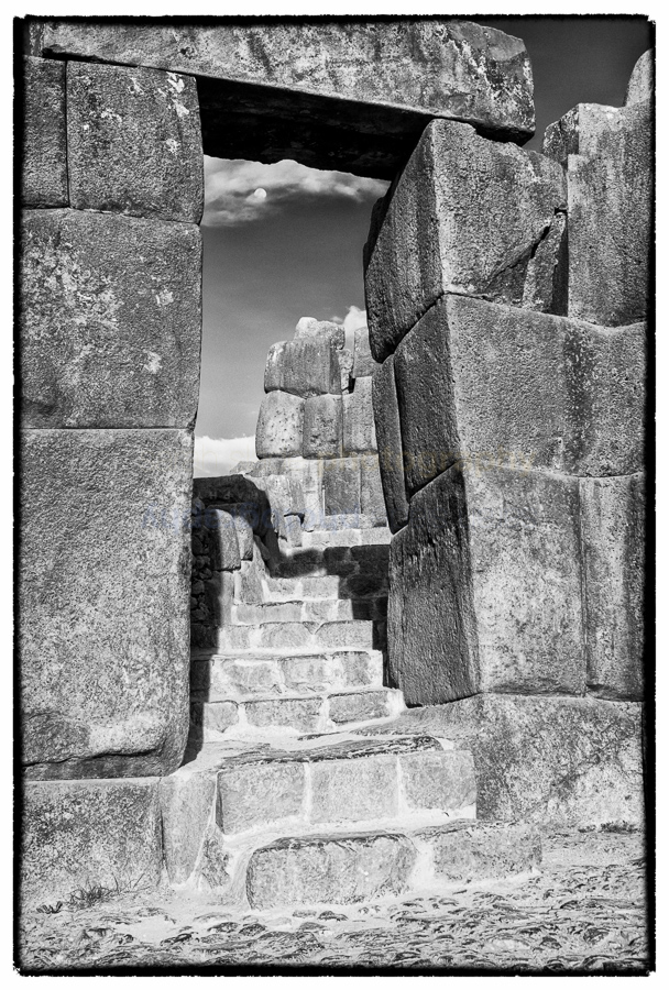 PT2012_04_Peru2011-172 Description: Sacsaywaman Inca ruins: monochrome view of the massive zig zag stone wall fortifications in late afternoon sunlight with typical trapezoid doorway and stairway, moon rising beyond, Sacred Valley, Cuzco, Peru Sacred Valley, Cuzco, Peru Keywords: Cusco, Cuzco, Format, Inca, Peru, Sacred Valley, Sacsaywaman, South America, age, archaeological, architecture, black and white, blocks, building, buildings, citadel, city, close up, closeup, clouds, country, detail, door, doorway, dramatic, excavation, fitted, fortification, fortress, heritage, historical, location, monochrome, moon, portrait mode, ruins, sky, stone, stonework, structure, style, trapezoidal, typical, vertical, view Dimensions: 3894 x 5766 Camera: Canon EOS 5D Mark II Exposure: 1/30 sec at f / 11 Focal Length: 47 mm ISO: ISO 200 Copyright: © PHOTOempt 2012