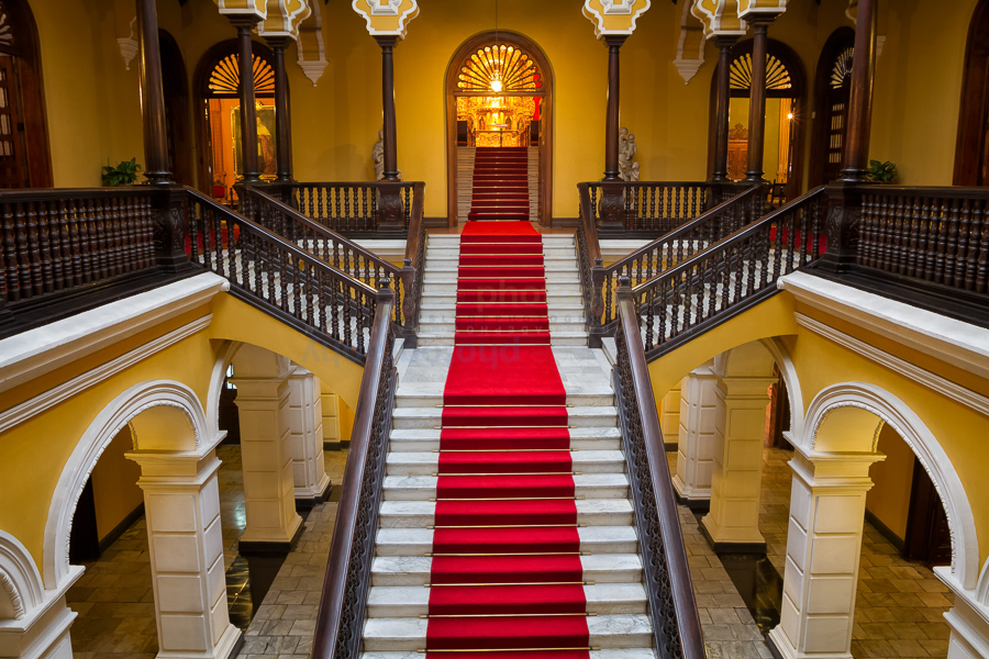 PT2012_04_Peru2011-28 Description: Archbishops' palace: Interior detail of red-carpeted staircase, mahogany balustrades, yellow stucco walls: Spanish Colonial style, Lima, Peru Keywords: Archbishop's palace, Baroque, Colonial, Format, Lima, Palacio de Arzobispal, Peru, South America, age, architecture, balustrade, building, building features, buildings, capital, carved, carving, city, country, decorated, decoration, door, historical, horizontal, landscape mode, location, mahogany, ornate, spanish, staircase, stairs, stairway, steps, structure, wood, wooden Dimensions: 5184 x 3456 Camera: Canon EOS 7D Exposure: 0,6 sec at f / 8,0 Focal Length: 17 mm ISO: ISO 640 Copyright: © PHOTOempt 2012