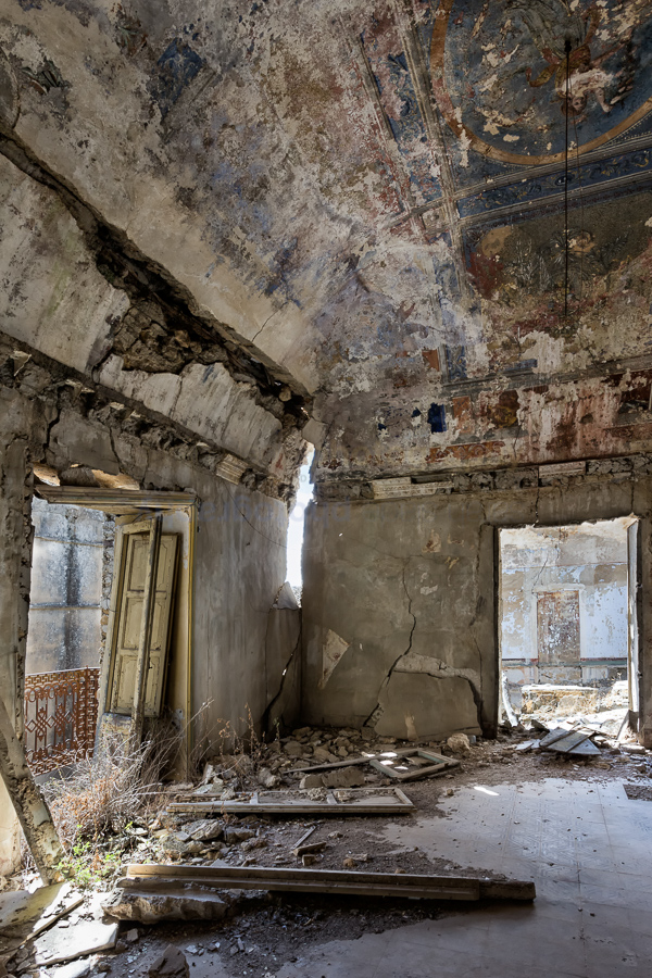 SSP2013_03_IT-153 Description: Poggioreale old town detail: room showing cracked walls, beautiful arched frescoed ceiling of an old palazzo all damaged and peeling, with fallen debris on floor, doorway leads to other room, rusty wrought iron balcony on the left with double folding door hanging on its hinge shows the opposite house in the street - destroyed by earthquake in 1968, the remains of the old stone buildings have been left as a shrine, Poggioreale, Sicily, Italy Keywords: Format, Italia, Italian, Italy, Poggioreale, Sicilia, Sicily, South, abandoned, architecture, building, buildings, ceiling, close up, closeup, country, crumbling, damage, damaged, destroyed, detail, door, doorway, earthquake, entrance, europe, frescoed, ghost town, interior, monument, painted, peeling, plaster, portrait mode, room, ruin, ruined, shrine, structure, stucco, town, vertical, view, wall, walls Dimensions: 3423 x 5135 Camera: Canon EOS-1D X Exposure: 1/25 sec at f / 16 Focal Length: 20 mm ISO: ISO 800 Copyright: © PHOTOempt 2012
