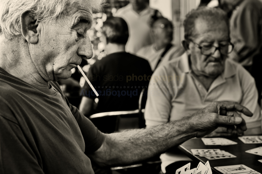 SSP2013_03_IT-2 Description: Villarosa, Sicily Italy - September 11 2012: Close up view of two older men playing cards at a table in outdoor cafe: one in profile with cigarette hanging from his mouth, arm outsretched to pick up a card as he checks his hand of cards, the other sitting facing the camera, monochrome image. Keywords: Format, Italia, Italian, Italy, People, Sicilia, Sicily, South, black and white, card game, cards, cigarette, close up, closeup, country, detail, europe, game, horizontal, landscape mode, monochrome, pattern, person, playing, playing cards, portrait, sitting, smoking, stylised, texture, view Dimensions: 5184 x 3456 Camera: Canon EOS-1D X Exposure: 1/200 sec at f / 5,0 Focal Length: 55 mm ISO: ISO 640 Copyright: © PHOTOempt 2012