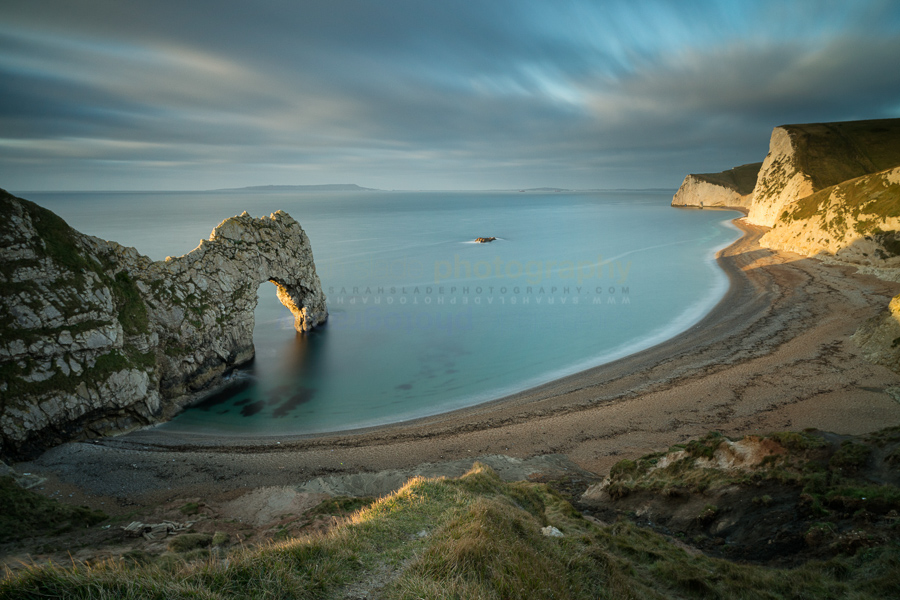 SSP2013_01-105 Description: Durdle Door panorama view from above in early morning, curve of sandy beach leading to curved rock formation and arch, golden sunlight glinting on the arch adn limestone cliffs beyond as it rises, wispy cloud formation in blue sky blurred by long exposure, sea smooth, at sunrise, Lulworth, Dorset, England Keywords: Beautiful, Britain, British, Dorset, Durdle Door, England, English, Format, Great Britain, ICM, Jurassic, Lulworth, UK, United Kingdom, arch, beach, beauty, blue, blur, cliffs, clouds, coast, coastline, country, daytime, dramatic, effect, environment, environs, horizontal, landmark, landscape, landscape mode, limestone, morning, motion, movement, natural, nature, outdoors, rock, rock formation, rocks, rocky, sand, scenery, scenic, sea, sky, smooth, time, view, water, waves Dimensions: 5184 x 3456 Camera: Canon EOS-1D X Exposure: 81,0 sec at f / 14 Focal Length: 21 mm ISO: ISO 400 Copyright: